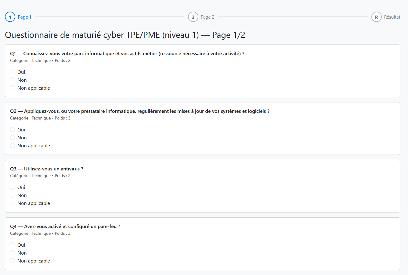 Les questions portent sur vos pratiques concrètes et votre organisation, pas sur des notions techniques complexes.