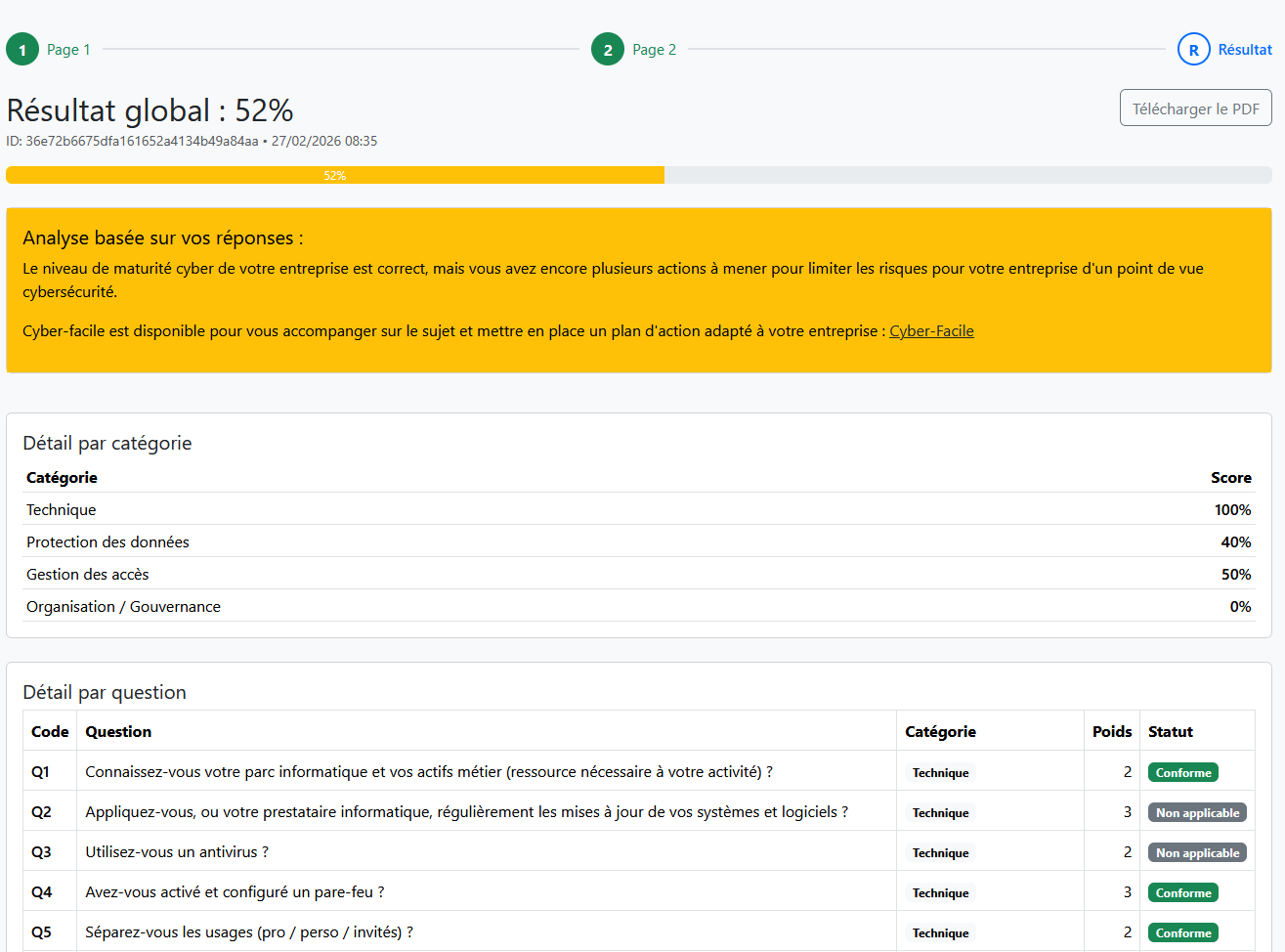 À l’issue du parcours, vous pourrez télécharger un rapport de synthèse en format PDF, récapitulant vos résultats et votre niveau global.
